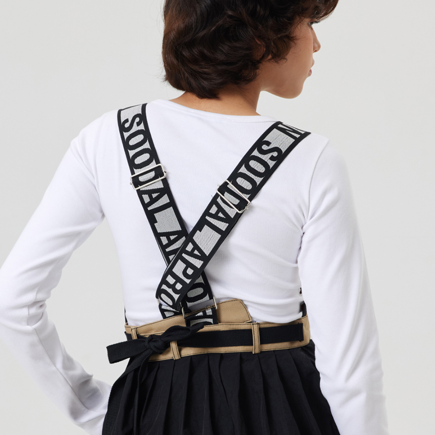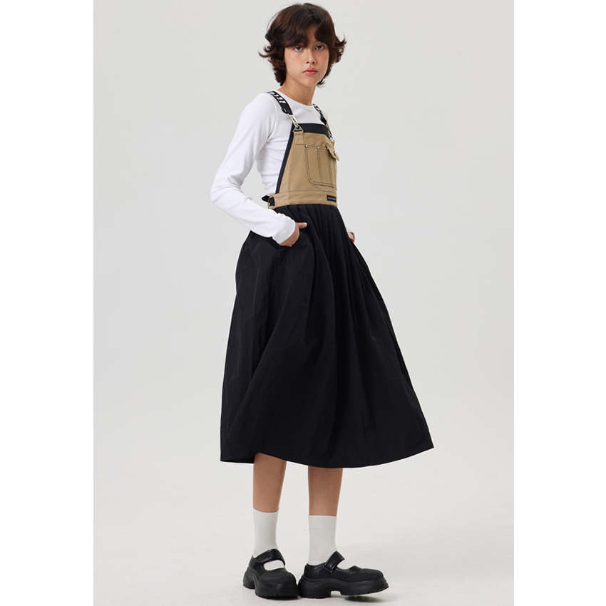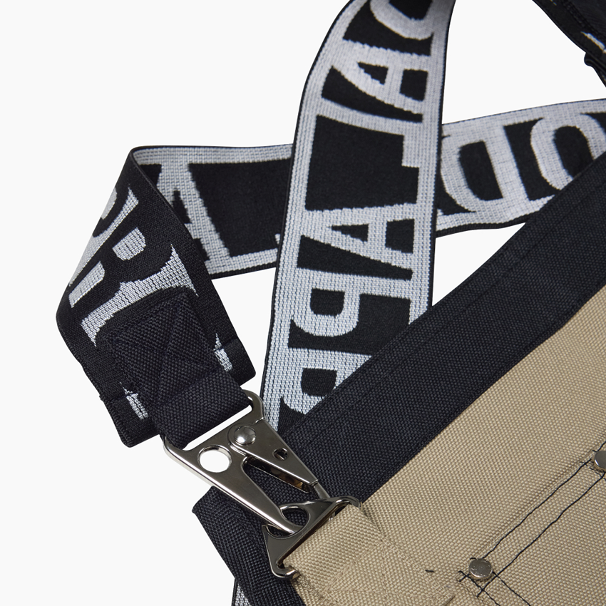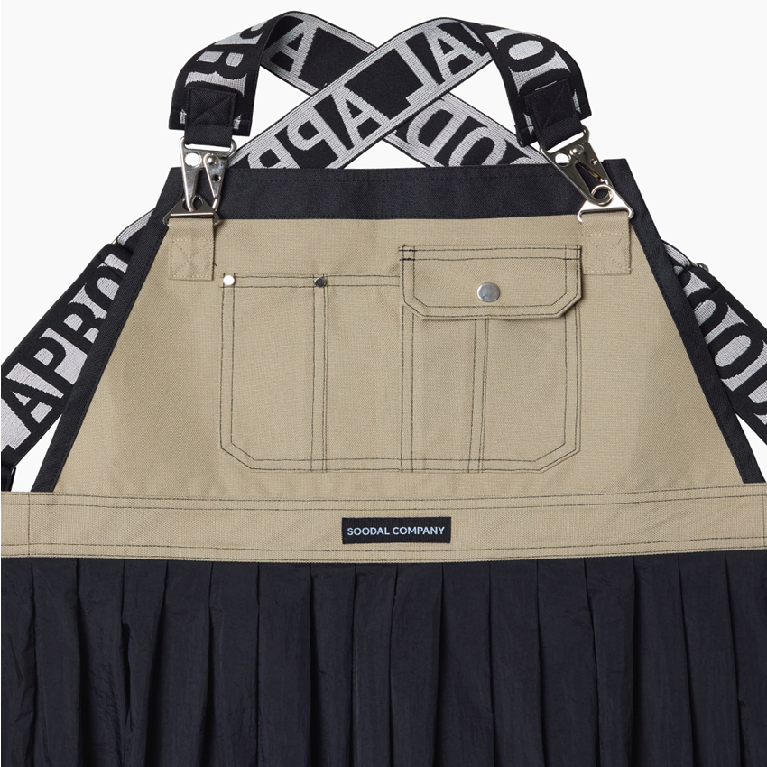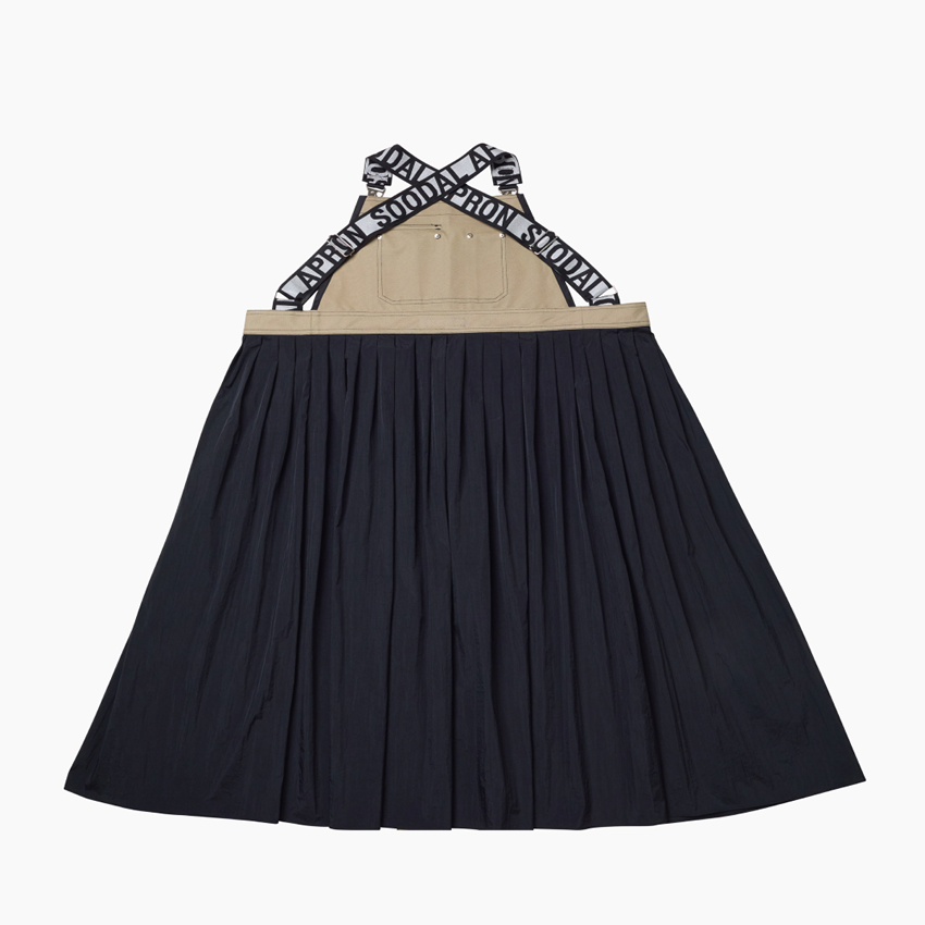 「プリーツ オーバーオール グラフィー エプロン」は、撥水機能を持つコットンとナイロン素材で軽量に仕上げられ、上下の異なる重みでバランスを調整しています。