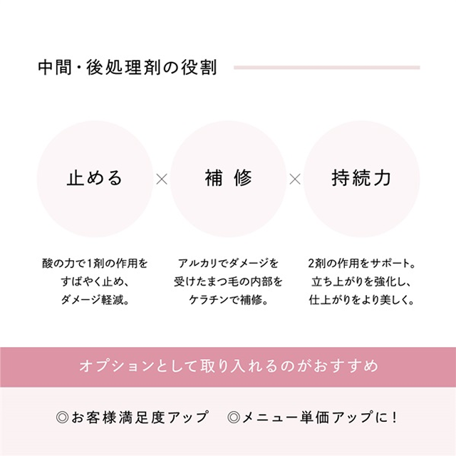 従来、精製水で行っていた中間精製・残留除去を短時間で効率的に行うまつ毛専用のトリートメント剤です。
