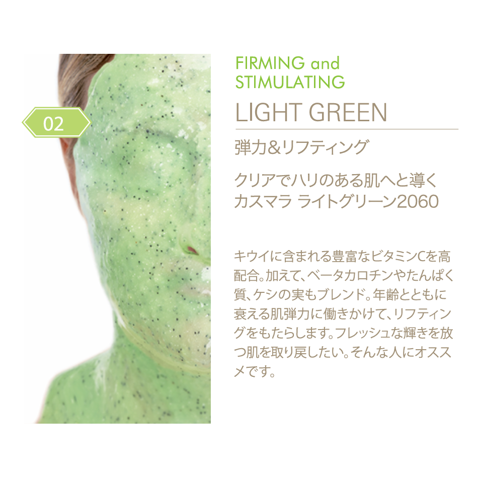 『カスマラ ライトグリーン2060』は、キウイに含まれる豊富なビタミンCをはじめ、ベータカロテンやタンパク質、ケシの実エキスを配合したリフティングマスクです。