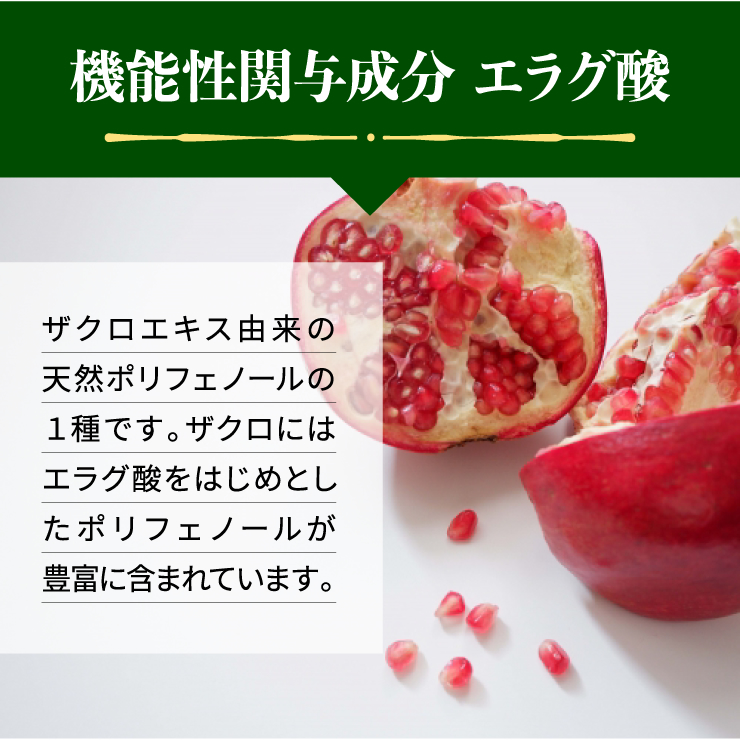 届出表示:本品にはエラグ酸が含まれています。エラグ酸は肥満気味の方の体重、体脂肪、血中中性脂肪、内臓脂肪、ウエスト周囲径の減少をサポートし、高めのBMI値の改善に役立つことが報告されています。
