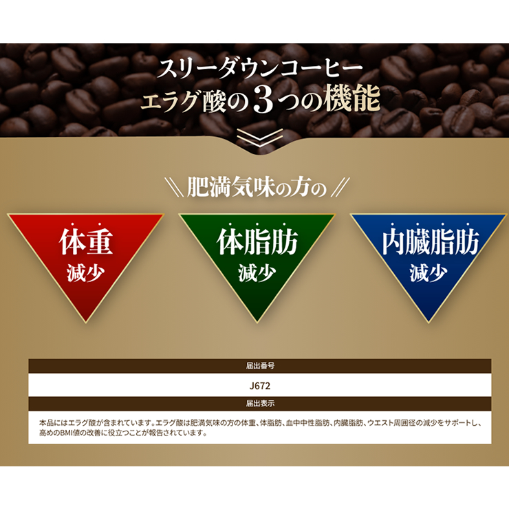 届出表示:本品にはエラグ酸が含まれています。エラグ酸は肥満気味の方の体重、体脂肪、血中中性脂肪、内臓脂肪、ウエスト周囲径の減少をサポートし、高めのBMI値の改善に役立つことが報告されています。