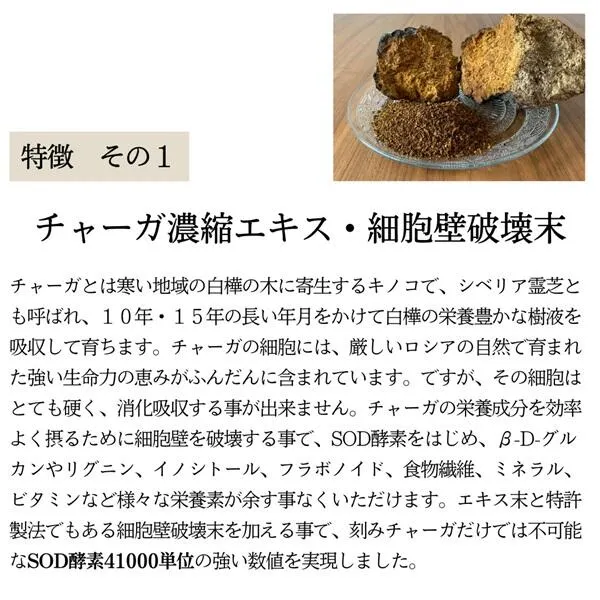 エキス末と特許製法でもある細胞壁破壊末を加える事で、刻みチャーガだけでは不可能なSOD酵素41000単位の強い数値と、100%無添加でありながら味わい深くコクのある円やかな美味しさを実現いたしました。