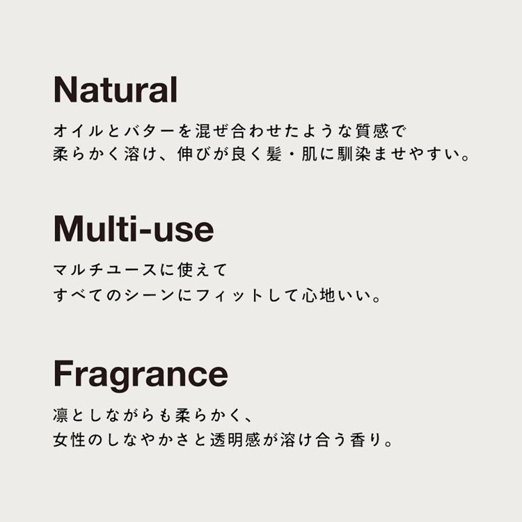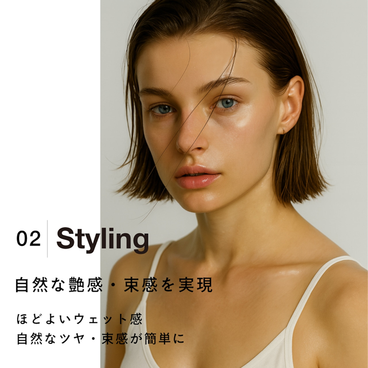 体温でやさしく溶け、伸びが良く髪や肌に自然になじみます。スタイリングでは程よいウェット感と自然なツヤ・束感を簡単に演出。