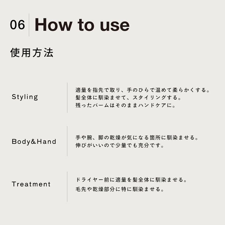 ・Body&Hand 手や腕、脚の乾燥が気になる箇所に馴染ませる。 伸びがいいので少量でも充分です。 ・Treatment ドライヤー前に適量を髪全体に馴染ませる。 毛先や乾燥部分に特に馴染ませる。