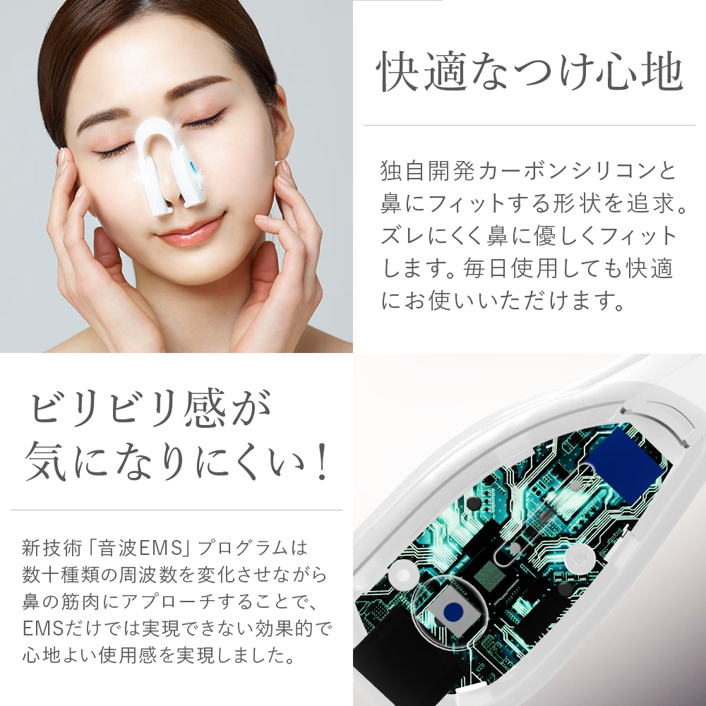 独自開発の鼻専用EMS × タッピング音波振動。ハイブリッド設計で理想の美鼻へ。