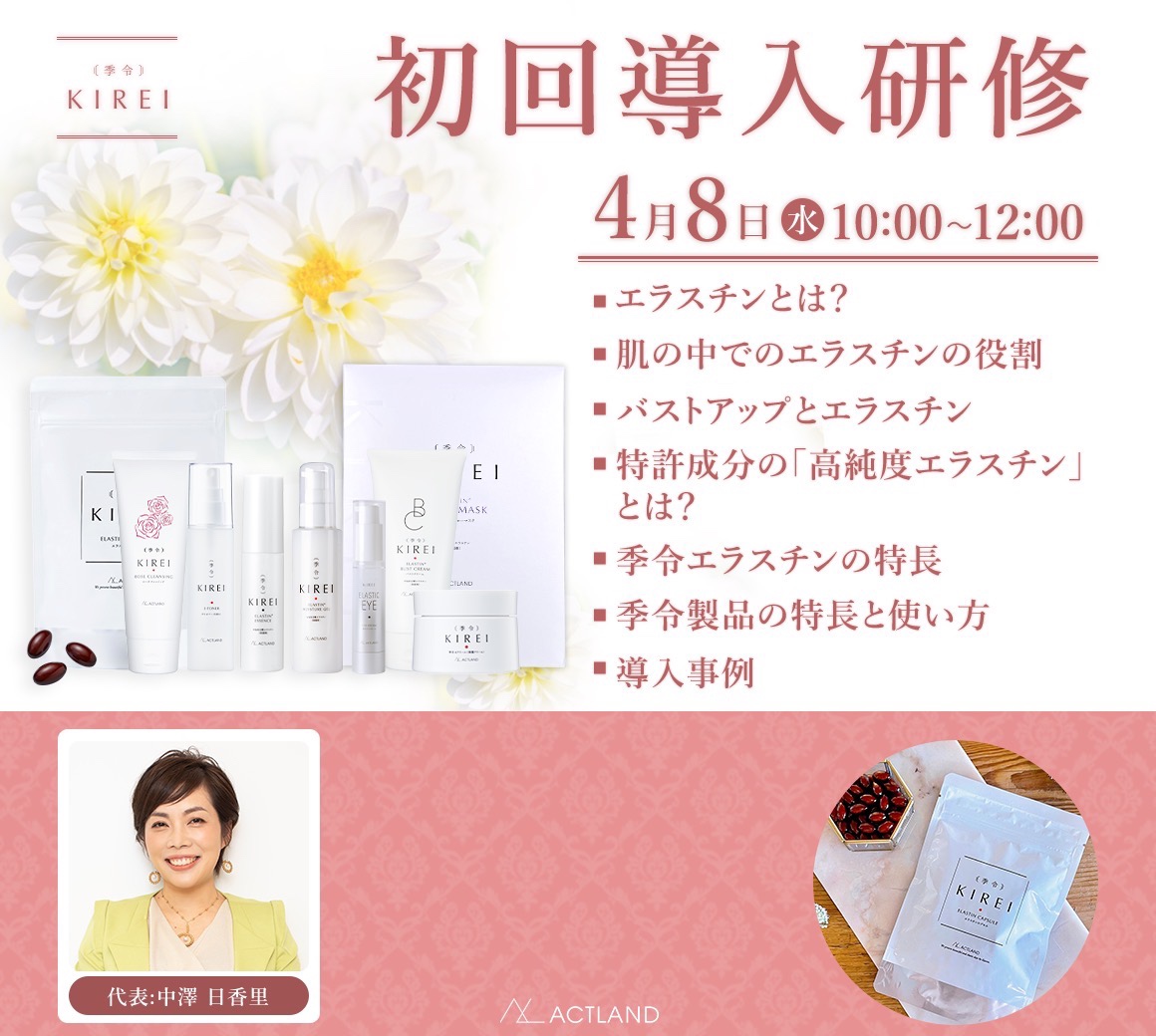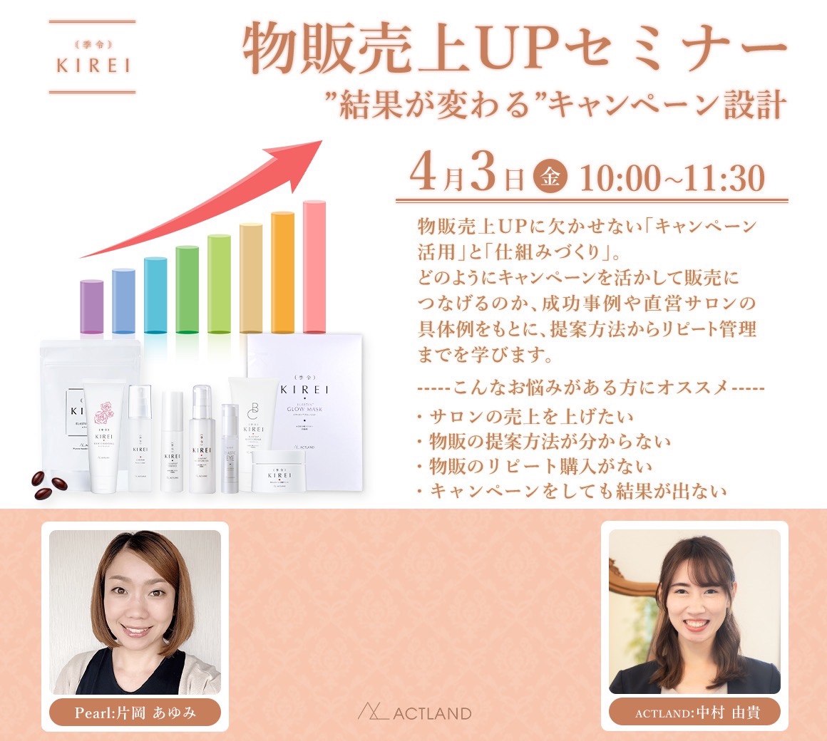 セミナーのご案内 季令セミナー 2026/03/11 更新 物販売上UPセミナー【日時】2026年4月3日(金) 10:00~11:30※顔出し参加OKの方のみご参加可能となります。※お名前を表示にてご参加ください。 お申込みはこちら 初回導入研修【日時】2026年4月8日(水) 10:00~12:00※顔出し参加OKの方のみご参加可能となります。※お名前を表示にてご参加ください。 お申込みはこちら
