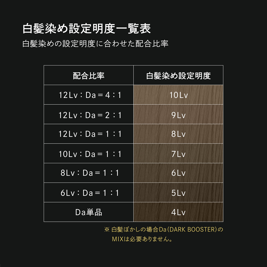 ※白髪染めの場合は「白髪染め設定明度一覧表」を参考に Da(DARK BOOSTER)をMIXします。