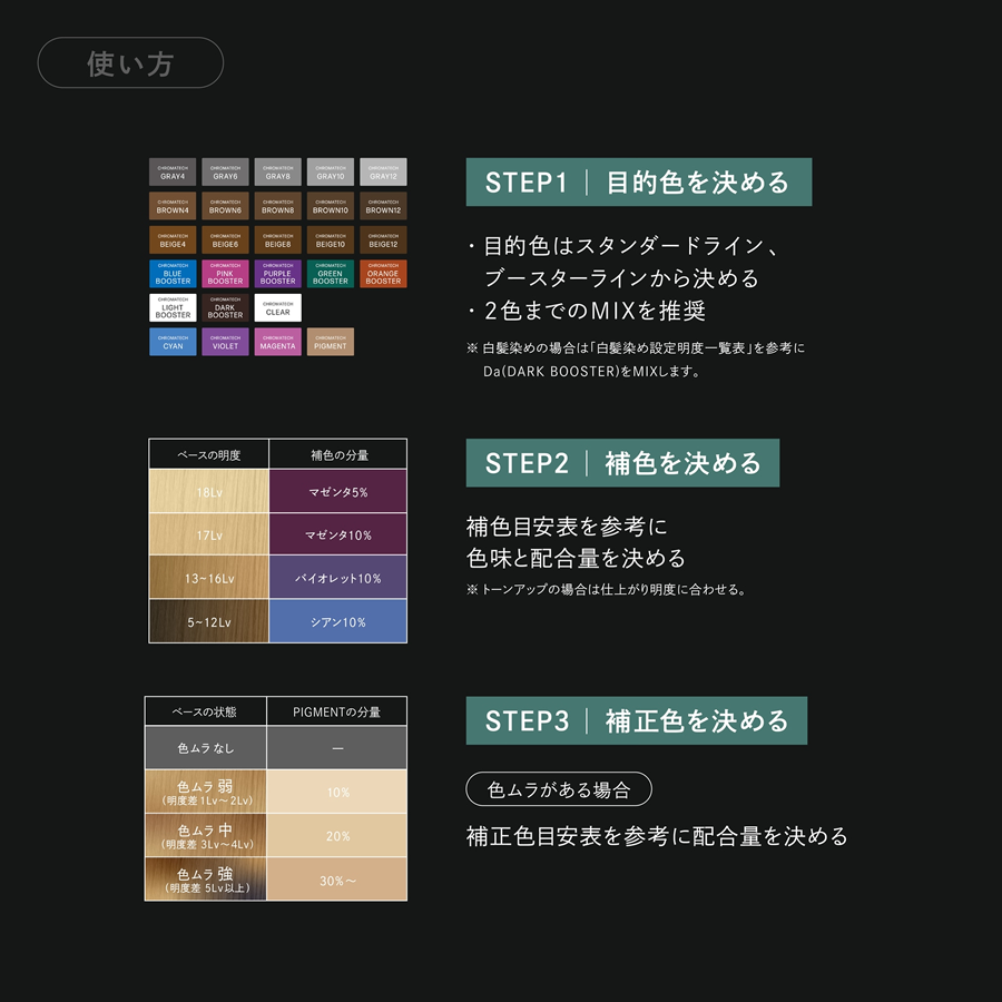 ※白髪染めの場合は「白髪染め設定明度一覧表」を参考に Da(DARK BOOSTER)をMIXします。