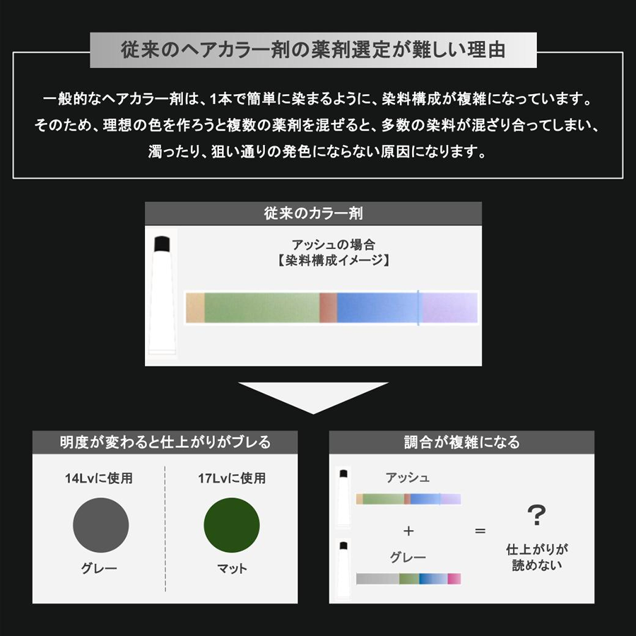 ※白髪染めの場合は「白髪染め設定明度一覧表」を参考に Da(DARK BOOSTER)をMIXします。
