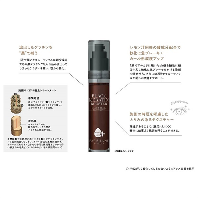 パリジェンヌラッシュリフト・まつ毛パーマにより失ったケラチンを「黒ケラチン」で補い、芯から強化。 さらには酸の力で軟化にブレーキをかけ、カール形成度アップ!