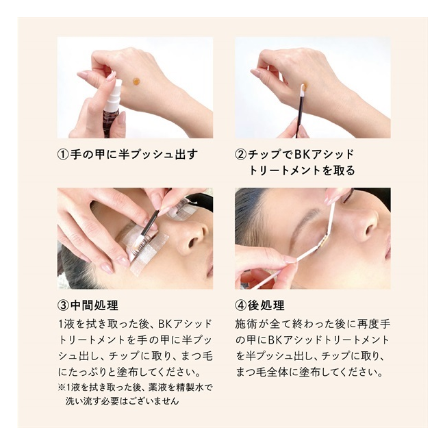 セッティング剤1剤を拭き取ったあと、BKアシッドトリートメントを半プッシュ出し、マイクロブラシホワイトに取り、まつ毛にたっぷりと塗布してください。