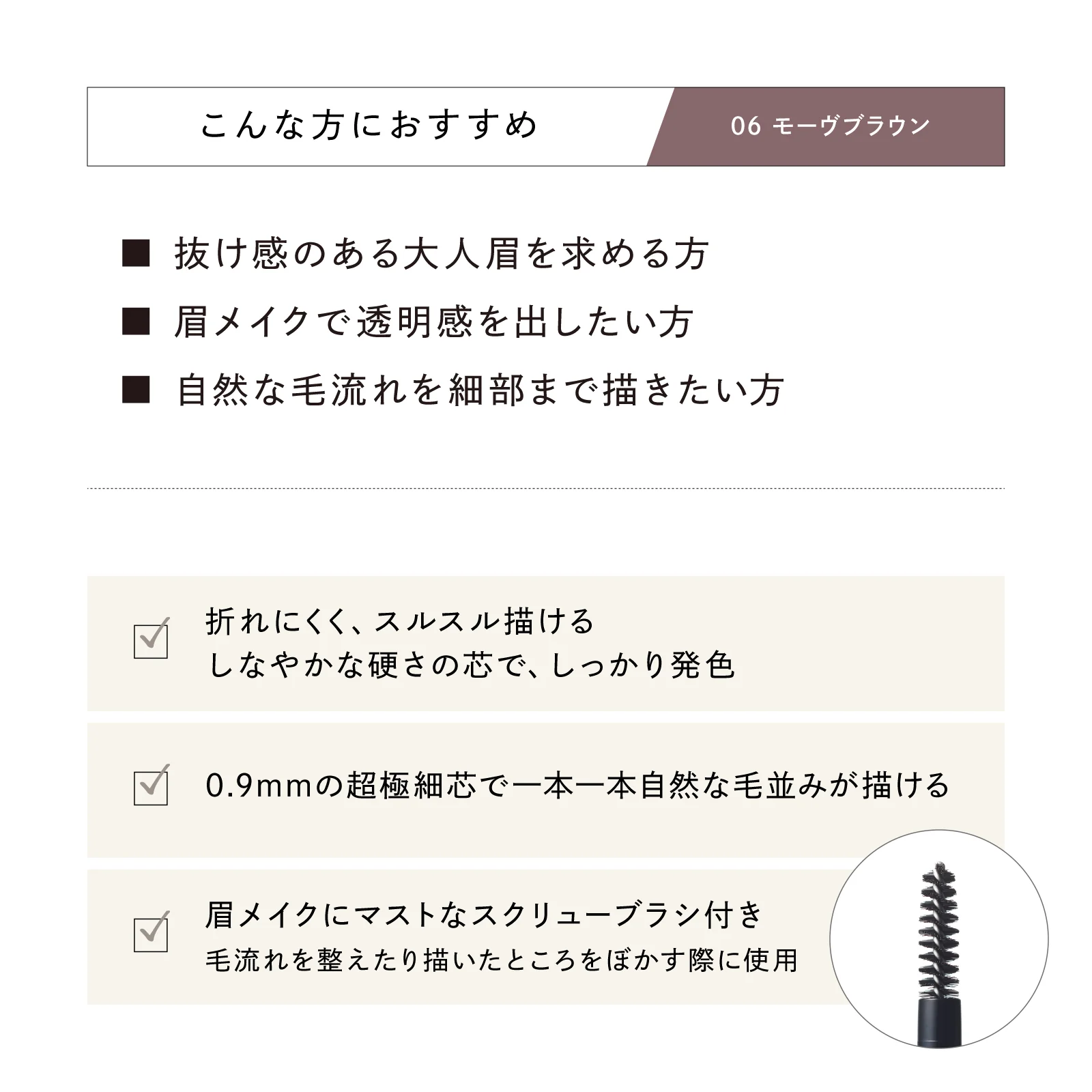 芯の硬さ・太さ・発色にこだわった0.9mmの超極細ペンシルで、眉の足りない部分に1本ずつ自然に描き足せます。眉頭や眉尻、隙間埋めに最適です。