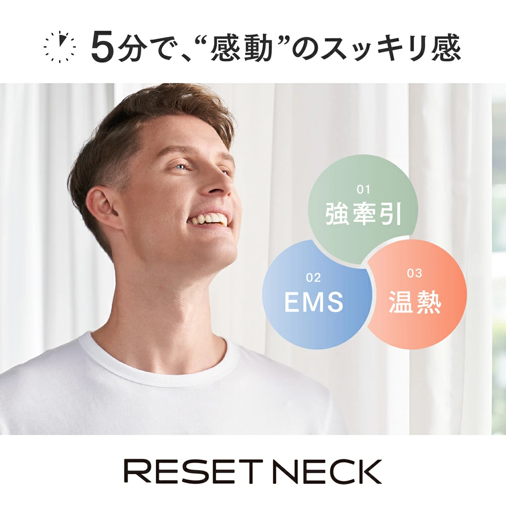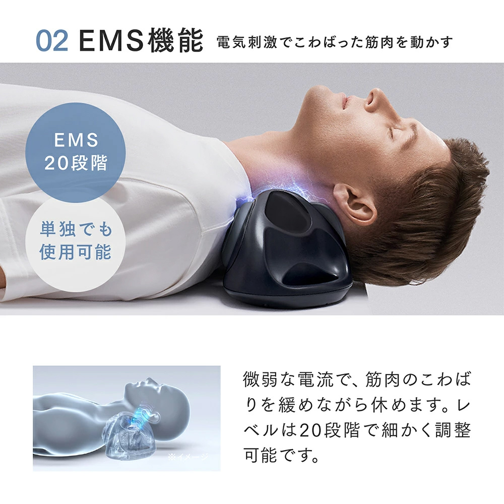 縦に引っ張るように首を伸ばすことで、つらい詰まり感を解放。さらに、EMSで筋肉を緩め、温熱で緊張をほぐします。