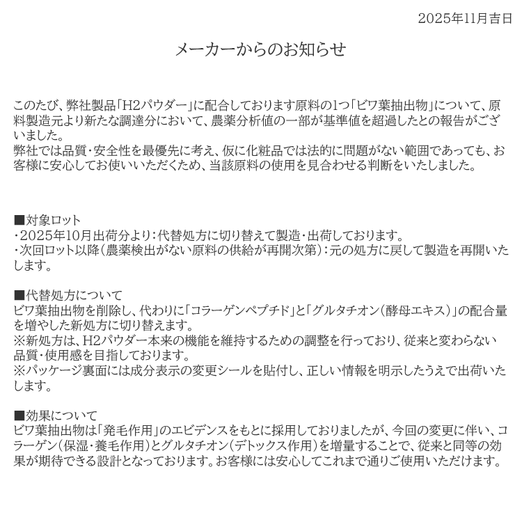 ・本品は、自然由来原料を主原料として使用しておりますので、内容物の色調などに差異が生じる場合がございますが、品質上問題ございません。